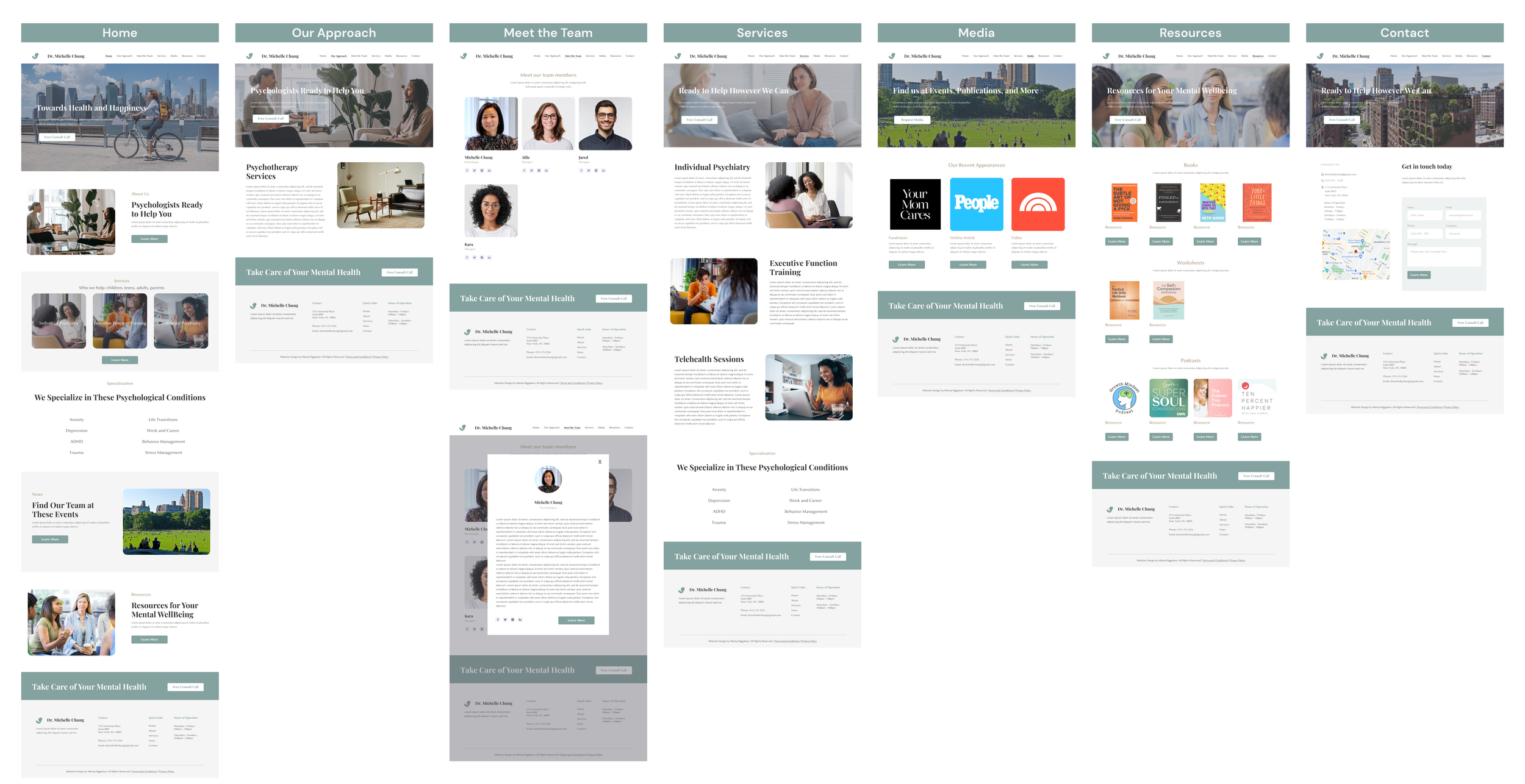 The most concrete solution to demonstrate a rebrand is to redesign the website. This website would have remade UI that complements the brand’s new aesthetic, new pages that establishes the transition to a group practice, such as new members and provided services, and improved UX and SEO that allows users to easily understand what the practice does and lead to an increase in new clients.