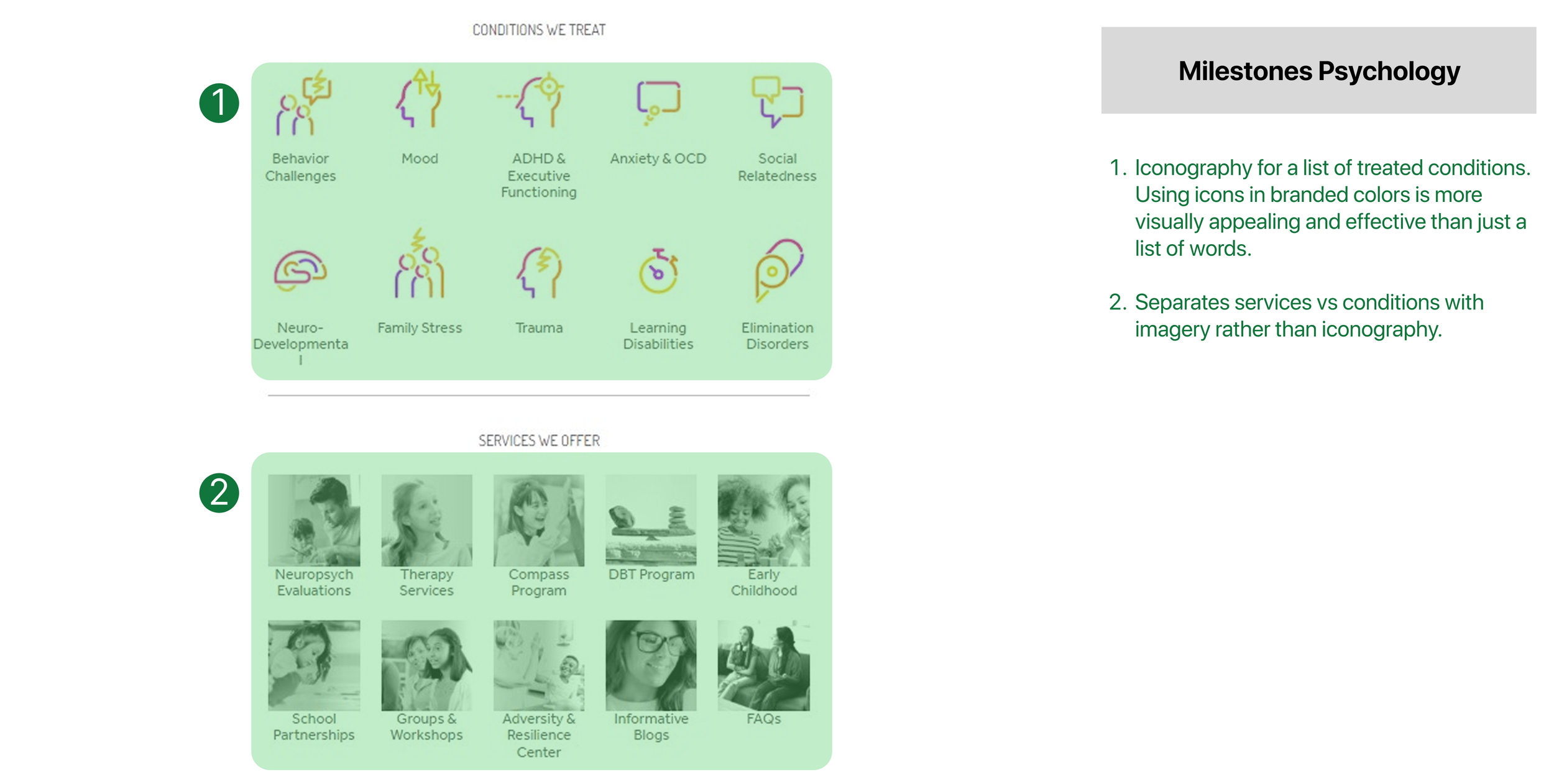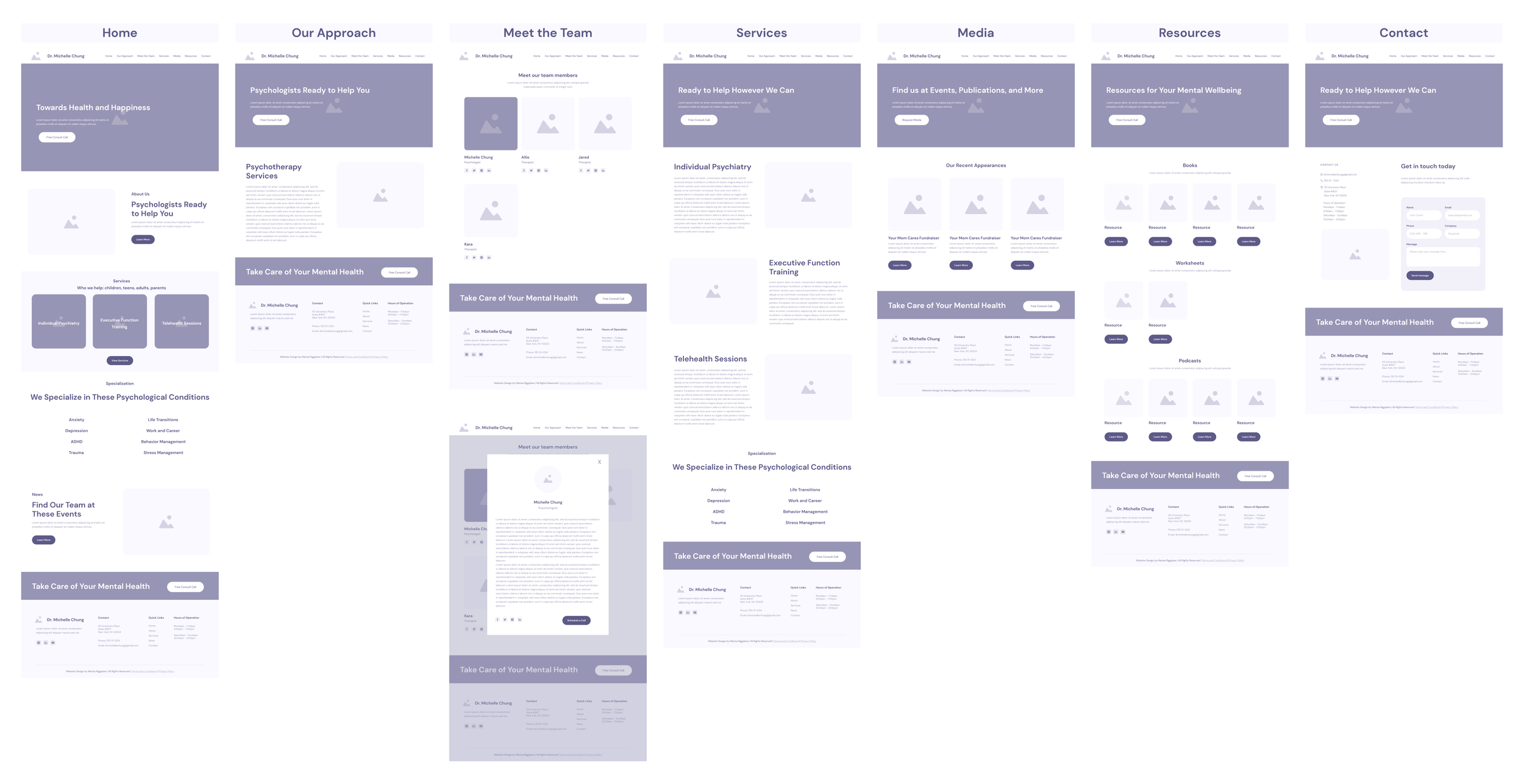 The ideation process for this project was primarily competitive analysis. I asked the client for other practices’ websites that appeal to them and analyzed the UI design to see what features and design choices I need to make for their website, along with the improvements I noted in the original review of the initial website.